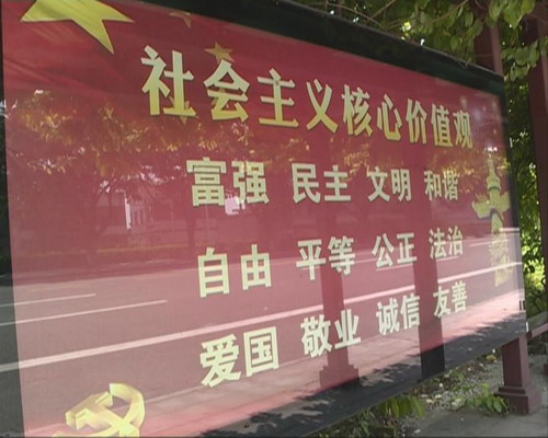记者谭恩婷:记者身后的公交候车亭不仅设置了公交线路指示牌,还贴满了核心价值观的宣传标语,宣传社会主义核心价值观,让文明创建工作深入民心。